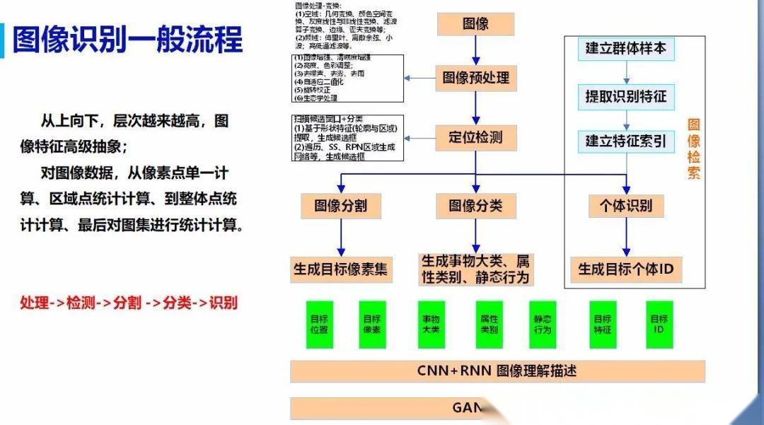 分类识别:分类包含三层,大类、属类、细类,检测到目标后,目标品牌或者品种细分类、目标属性分类(颜色、形状、属类等)、静态行为分类、序列行为分类;提取目标特征,结合类别进行以图搜图识别。