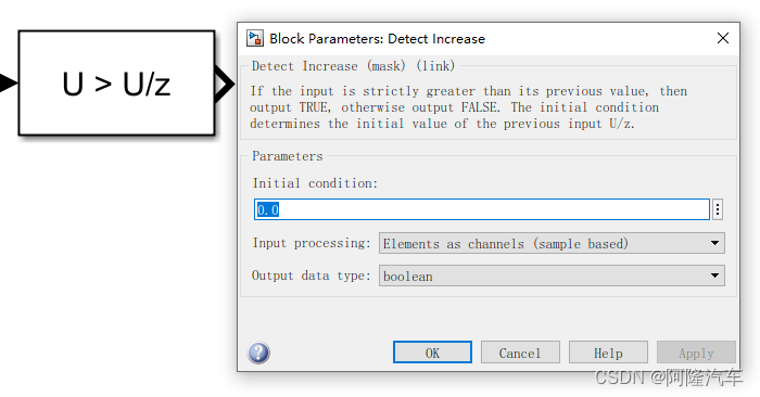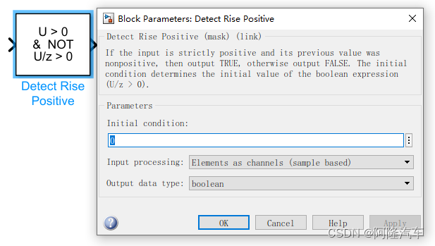 上一个时刻为非正数,这个时刻为正数的时候,输出为true