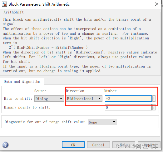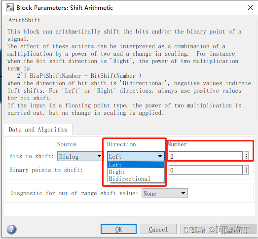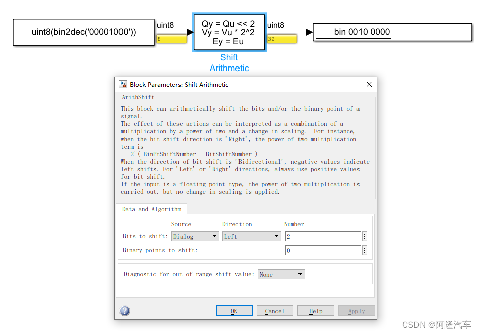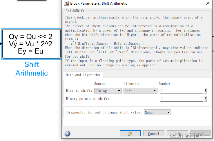 向左移2位,相当于乘以2的2次方。向右移3位,相当于乘以2的-3次方。模型中的乘法运算如果是2的n次方运算,生成代码可以优化为移位运算,增加运行效率。