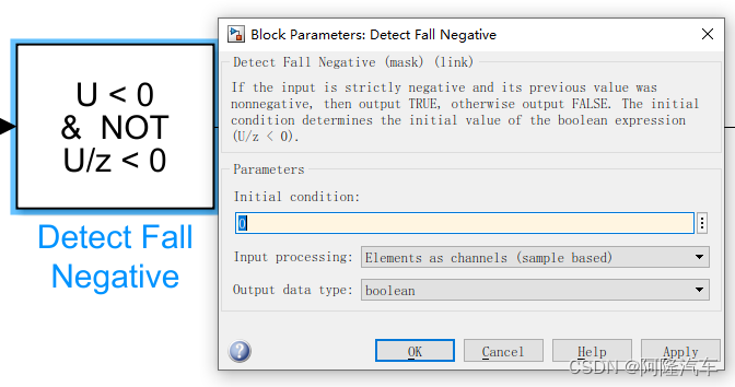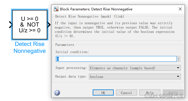 上一个时刻为负数,这个时刻为非负数的时候,输出为true