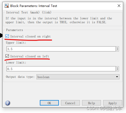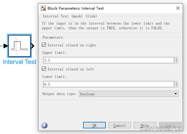在区间内输出true,区间外输出false。设置区间的上下限值,比如这里设置的0.5到3.5的区间。