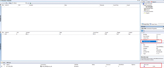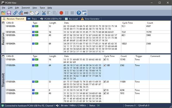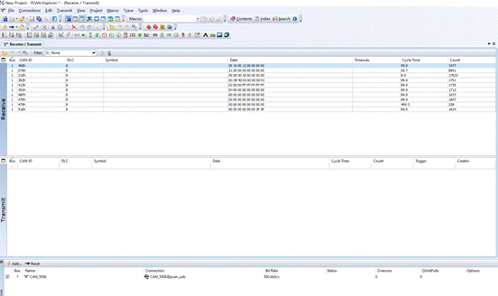 使用另一个设备发送报文,这边进行接收,然后可以看到报文在持续接收,Cycle Time有值,Count在累加。硬件设备的灯这时候是闪烁状态