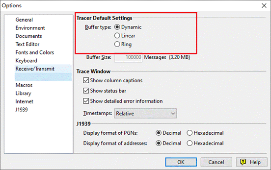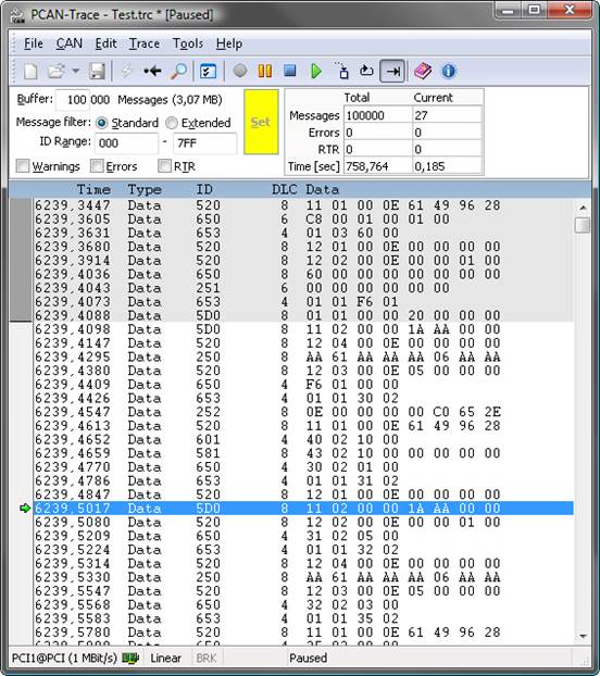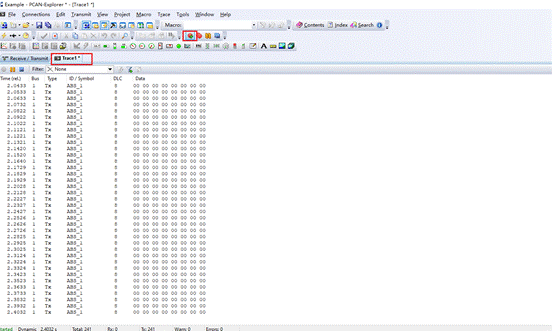 可以用来记录报文。PCAN-Trace程序是一个数据记录仪,最多可存储9,999,000条CAN报文。它使CAN报文可以快速记录,保存,甚至在CAN总线上回放。该程序显示接收到的报文的数量,并标识报文的类型(数据帧,错误帧,RTR帧)
