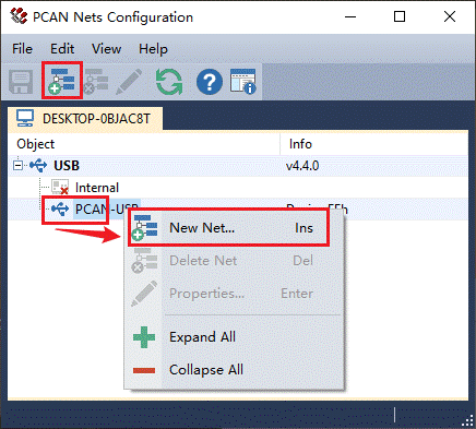 在弹出的窗口中,选择PCAN-USB,然后鼠标右键,在弹出的菜单中选择New Net,或者等效于选择PCAN-USB点击上面的图标