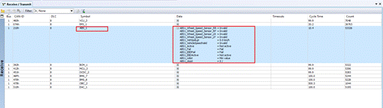 然后再回到发送接收窗口,这时候看到报文已经被解析了。我们随便点开一下ABS的报文,如果这时候我们在最前面提到的问题比较明显的话,我们通过看报文的物理值就能分析出来了