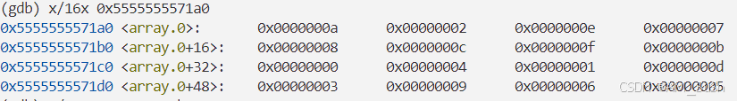 x/[count][format] [address]:打印指定格式指定数量的内存值