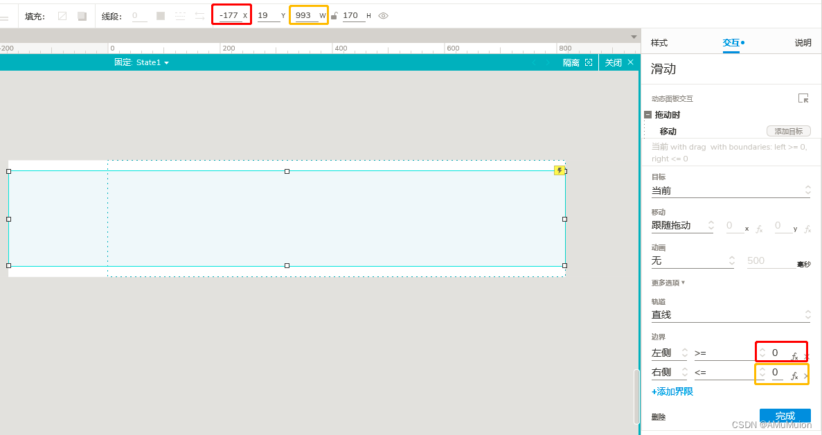 将“滑动”向左拖动至右边框与“固定”右边框重合,分别读取数值,x轴偏移值为左侧边界;“滑动”区域宽为右侧边界值;