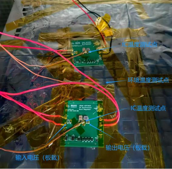 低温启动测试记录:Vout=1.2V空载启动时间26.7ms,满载(4.8A)29.1ms;Vout=3.3V空载26.9ms,满载29.1ms。表明峰值电流限在低温下未显著退化,但后续测试发现"DCM模式无法正常工作",揭示轻载模式存在温度敏感点。