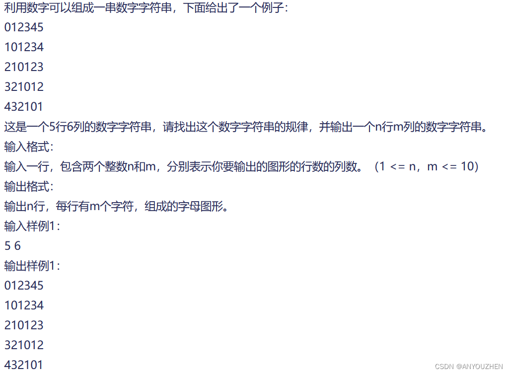 该代码示例展示了如何使用C语言生成特定的数字序列。程序分为两部分循环输出,一部分是从0递增到n的数字,另一部分是从1递增到m的数字,两者交替打印,形成特定模式。在达到预设边界时,程序自动换行。