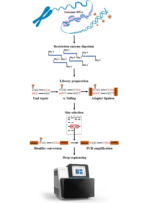 RRBS是Reduced representation bisulfite sequencing的简写,意为“简化基因组甲基化测序”。是利用限制性内切酶对基因组进行酶切, 富集CpG岛以及启动子等区域,并经Bisulfite处理后,进行单碱基分辨率的甲基化测序。