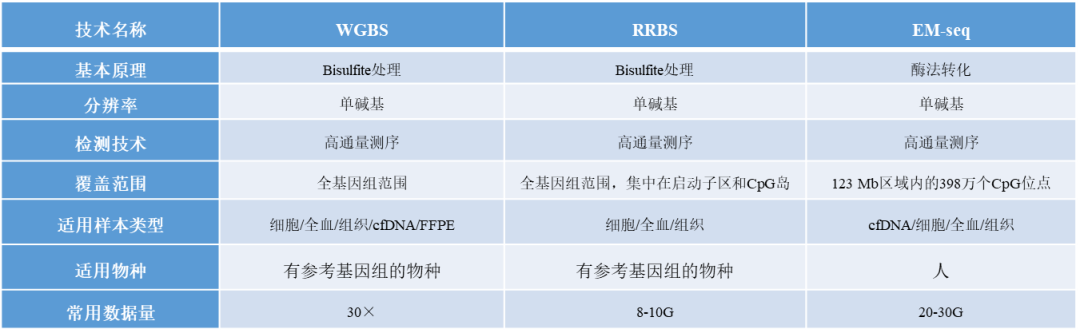 RRBS是用于研究基因组上5mC甲基化修饰的一种方法。我们提供最常用的三种基因组甲基化研究方法,它们的区别如下表。