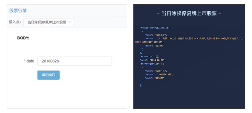 接入点说明:可获取当日停复牌、新上市、除权等信息的股票列表。