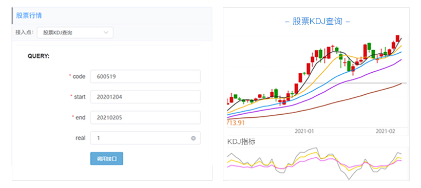 功能:查询沪深两市股票历史的KDJ(随机指数)(9,3,3)最大查询时间段跨度为31天。