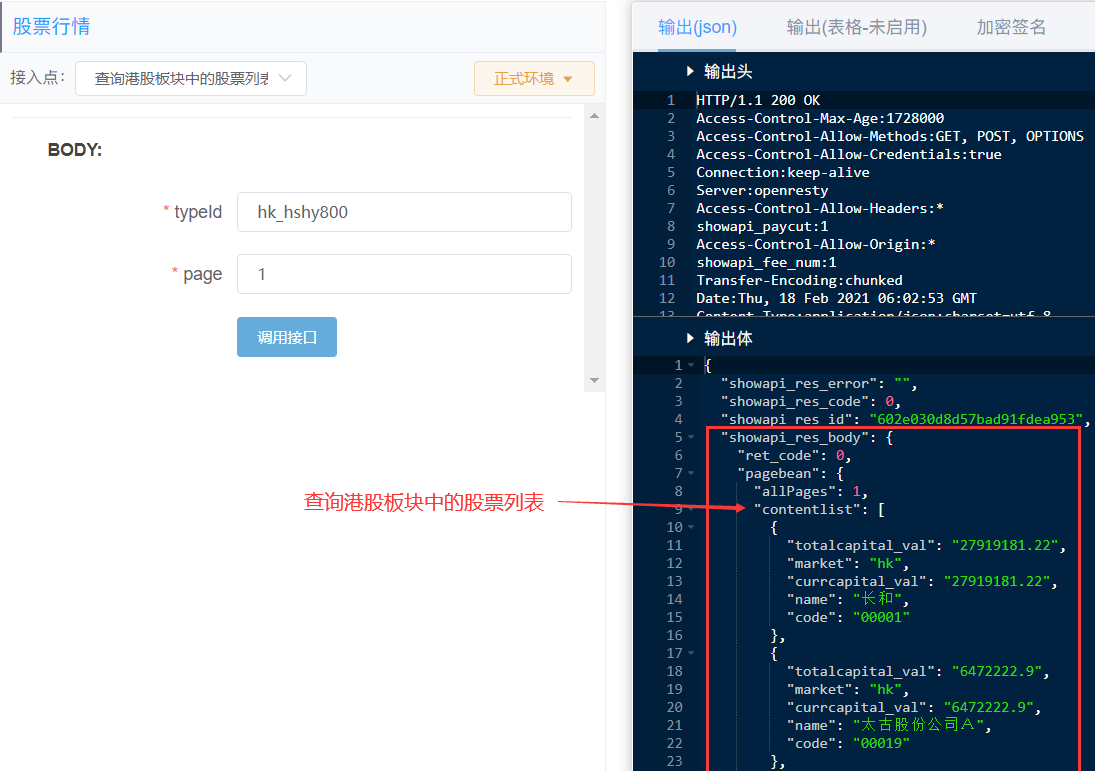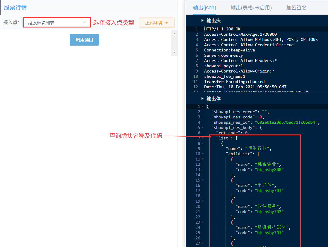 功能:根据港股板块编码,查询某板块下所有的股票列表,比如查询 恒生行业、创业板、A+H、国企股、红筹股、蓝筹股板块下的股票列表。