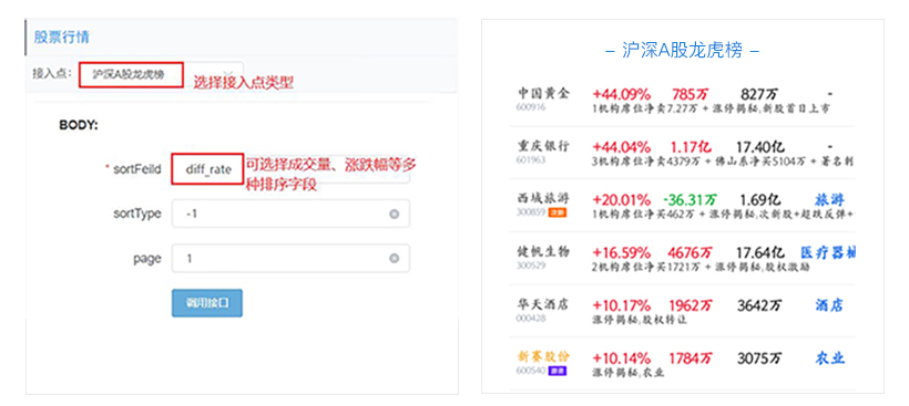 功能:目前支持沪深A股三千多只股的排行,可用以下字段进行排行:nowPrice(当前价)、turnover(换手率)、maxPrice(最高价)、openPrice(开盘价)、pb(市净率)、pe(市盈率)、closePrice(收盘价)、minPrice(最低价)、diff_money(涨跌额)、tradeAmount(成交量)、swing(振幅)、diff_rate(涨跌幅)、tradeNum(交易量)。