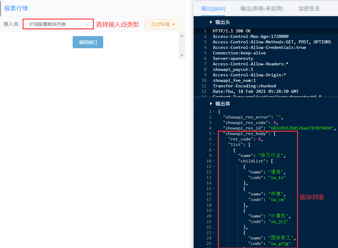 功能:根据板块编码,查询某板块下所有的股票列表,比如查询 申万行业、概念板块、地域板块、证监会行业板块下的股票列表。