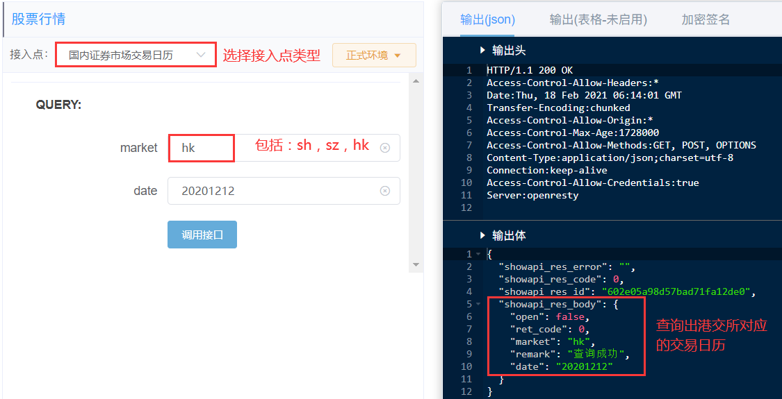 功能:通过某日日期,查询国内证券市场是否开市交易。