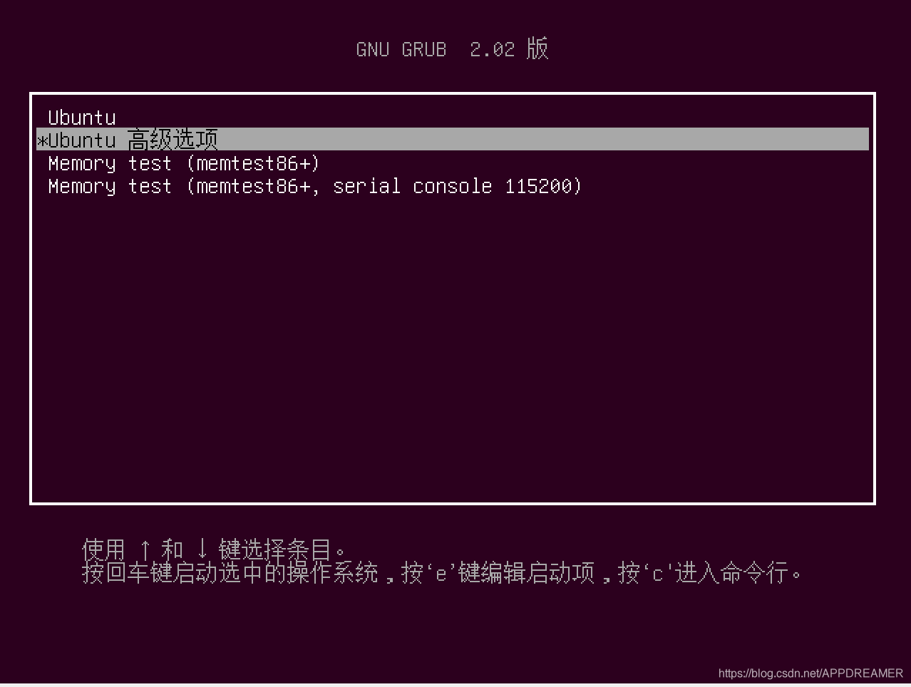(1)在此界面中选择Ubuntu高级选项(有的电脑会没有这一步,会直接转到登陆界面,遇到这种情况直接输入密码登入Ubuntu即可,这其实也是成功的标志)
