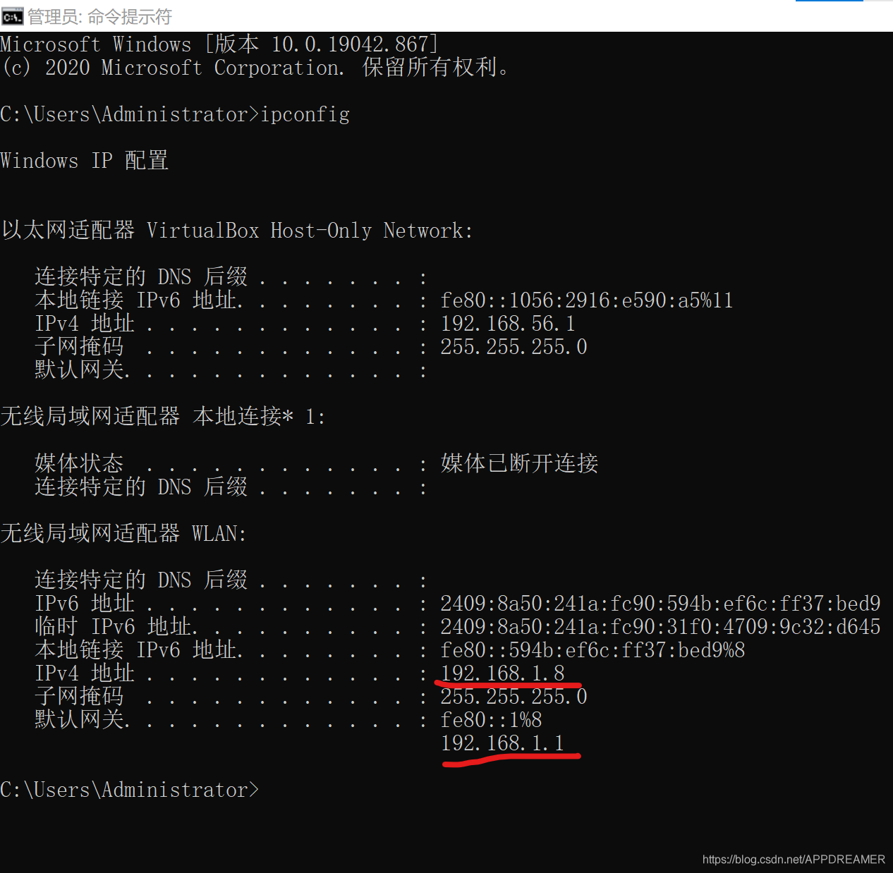 1、在Windows10的命令行中使用指令ipconfig查看Windows系统的IP地址和网关地址(注:图中红线所划位置数据即为我们要查看的地址)