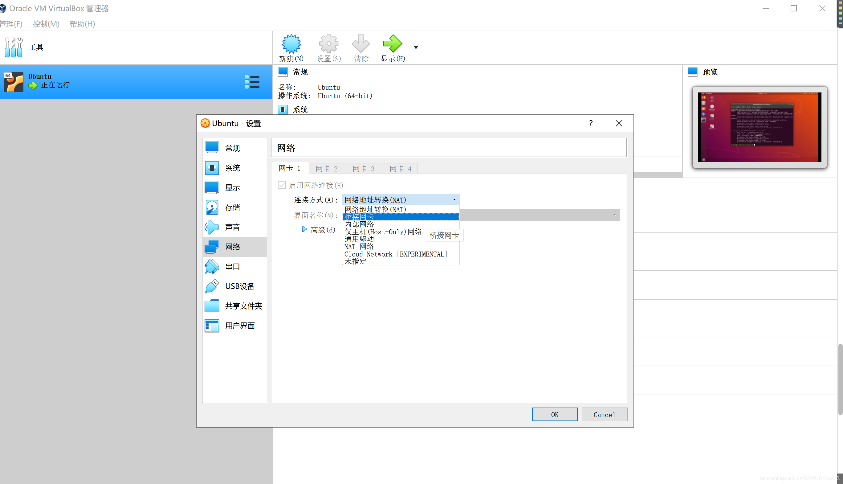 2、打开虚拟机Oracle VM VirtualBox,点击连接方式选择桥接网卡(注:界面如下:)