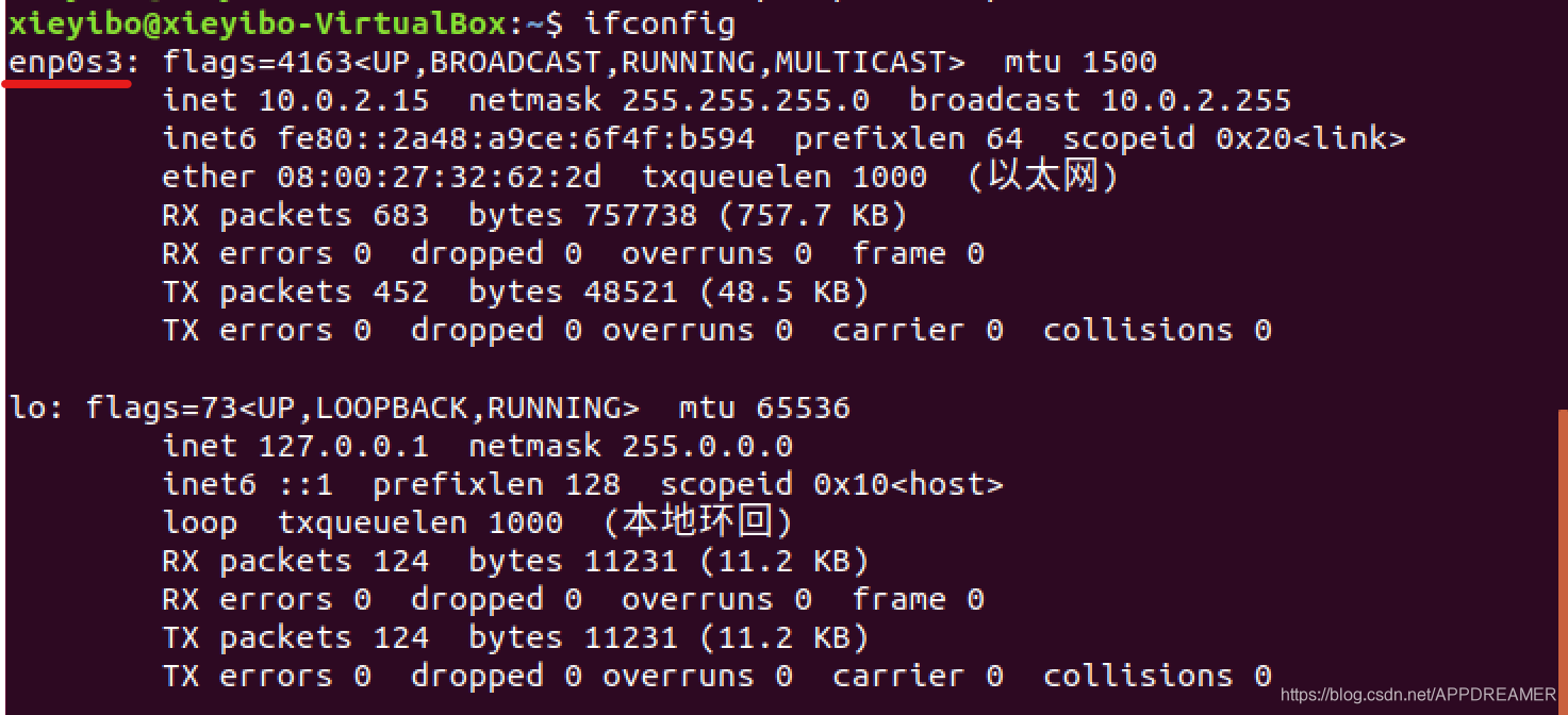 5、重启后使用指令ifconfig查看Ubuntu的IP。(注:成功界面如下)