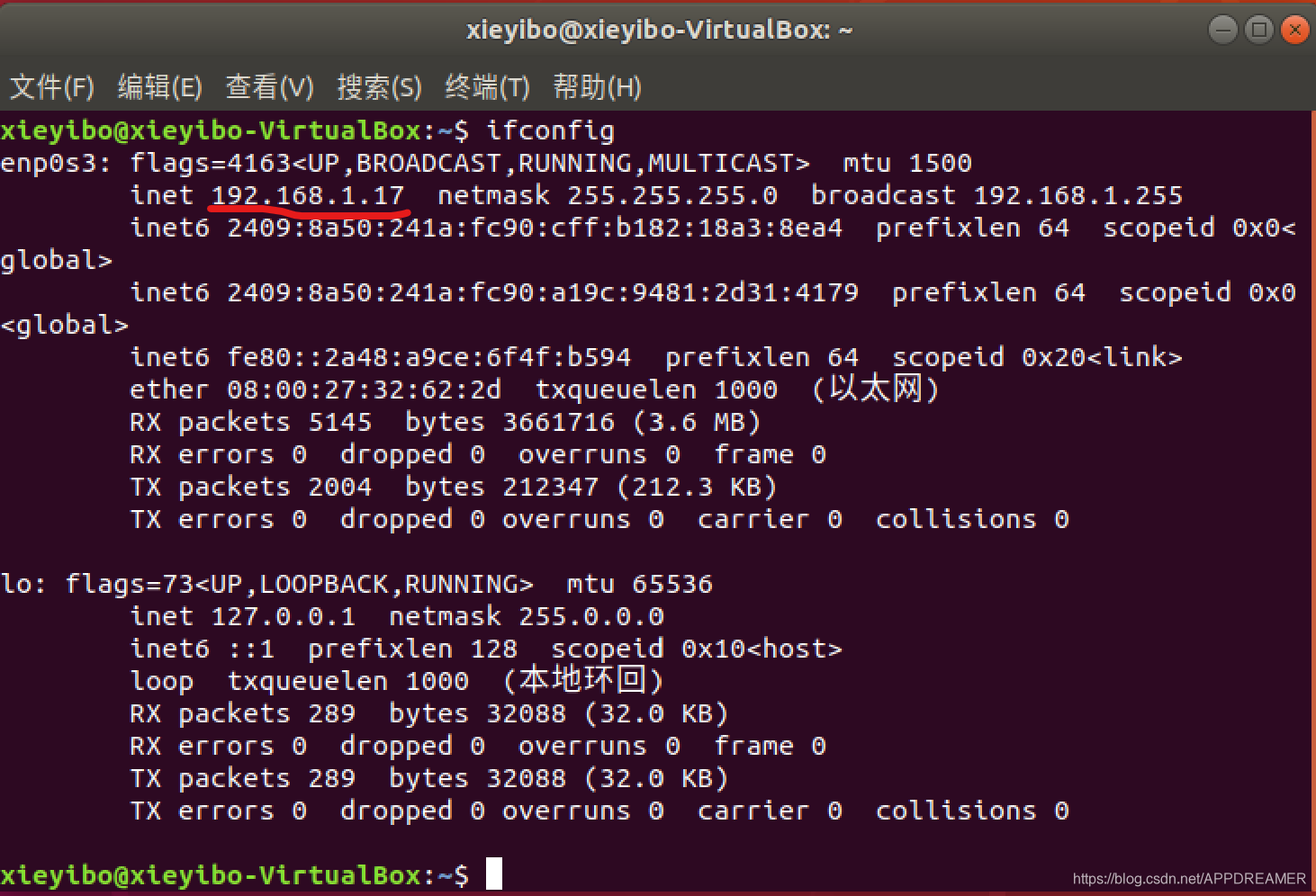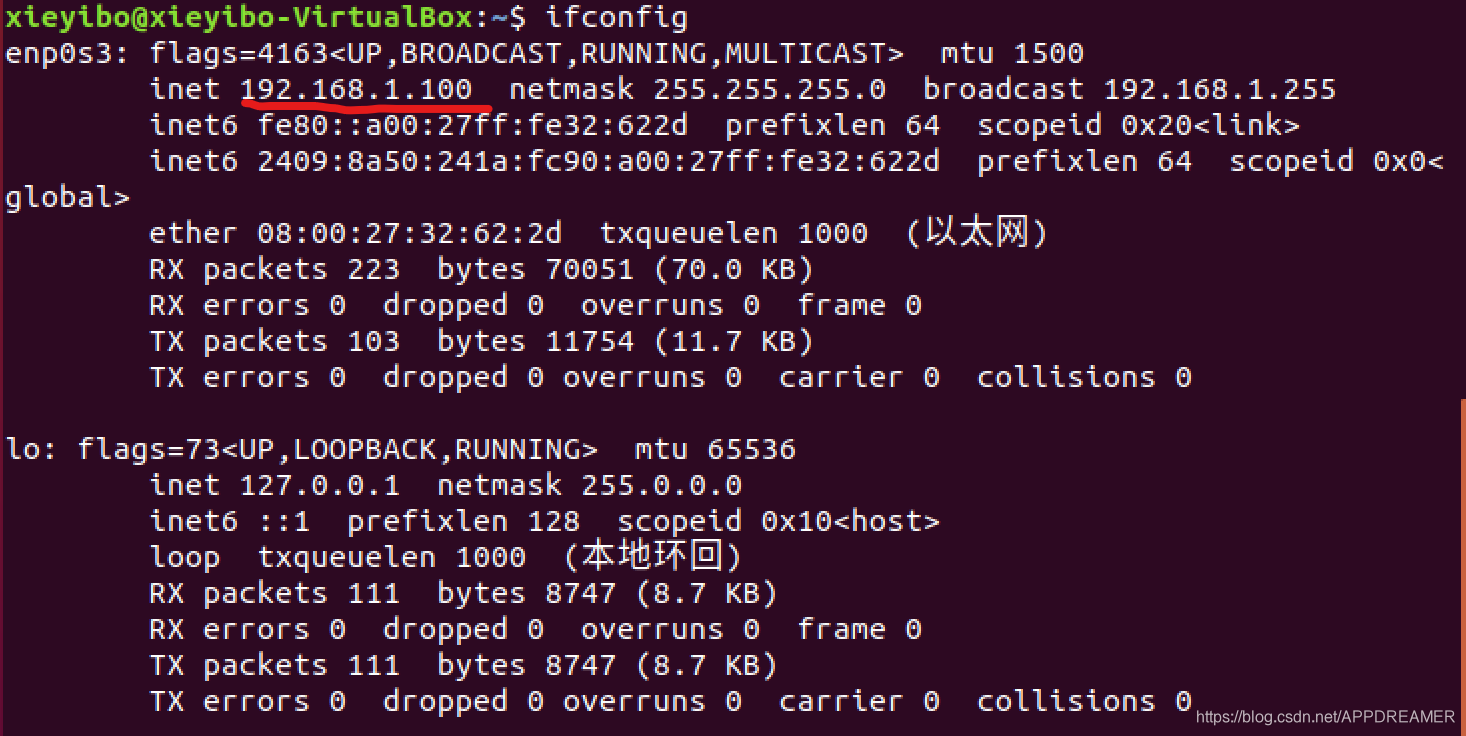 3、启动Ubuntu,然后打开终端,使用指令ifconfig查看Ubuntu的IP地址(注:图中红线所划位置即为Ubuntu的 IP地址)