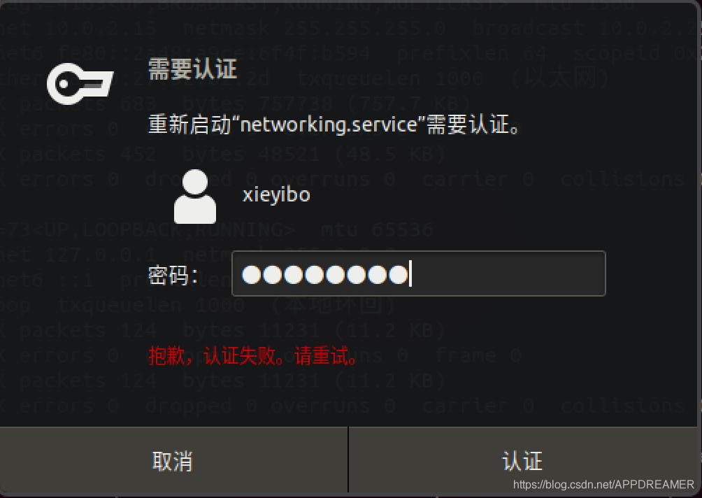 3、使用指令systemctl restart networking.service重启网卡服务(注:在弹出来的如图所示界面上输入自己的密码进行认证)