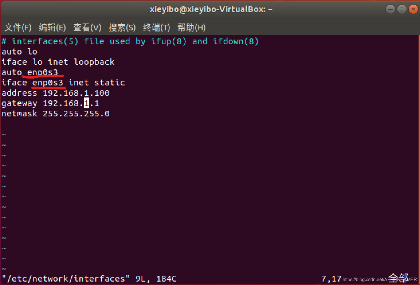 iface enp0s3 inet static #把网卡设置成静态的