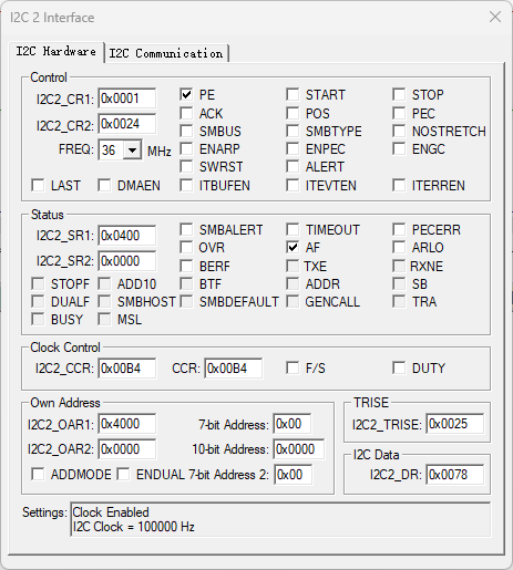 在 Keil 仿真环境中,可以通过 “Peripherals → I2Cx”(如 I2C2)查看 I2C 外设的寄存器状态,间接验证 I2C 通信过程: