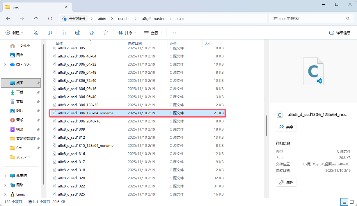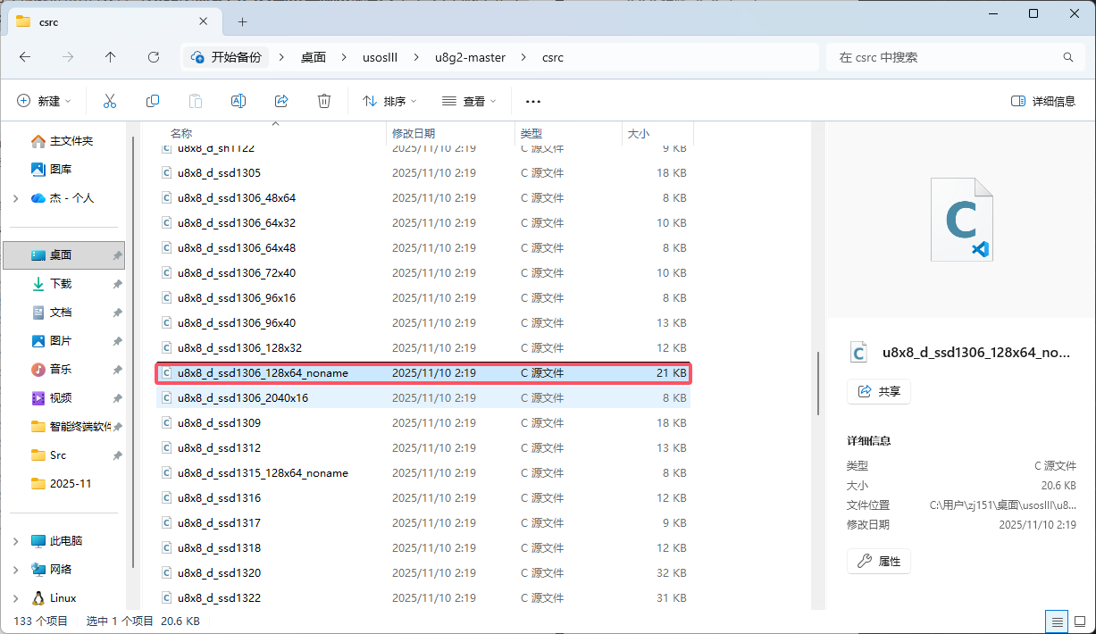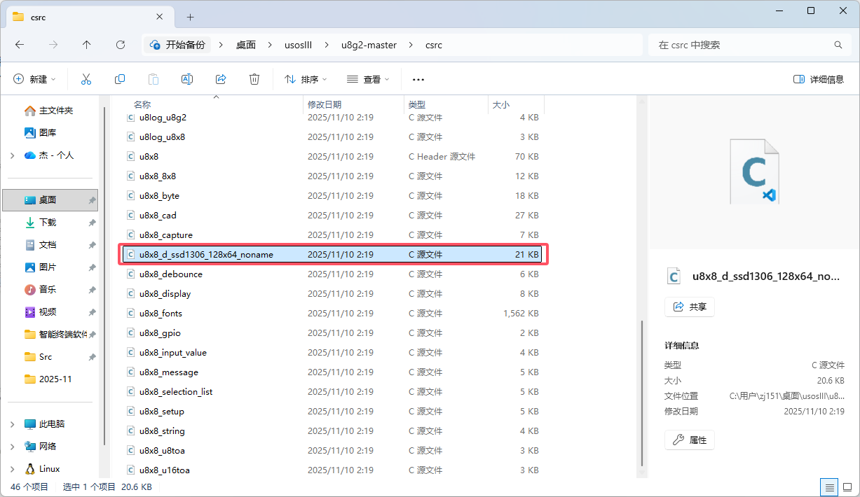首先,类似 u8x8_d_xxx.c 命名的文件中包含 U8x8 的驱动兼容,文件名包括驱动的型号和屏幕分辨率,因此需要删除无用的驱动文件,只保留当前设备的驱动。例如,本次使用的是 128x64 的 SSD1306 屏幕,那么只需要保留 u8x8_ssd1306_128x64_noname.c 文件,删除其它类似的文件即可。