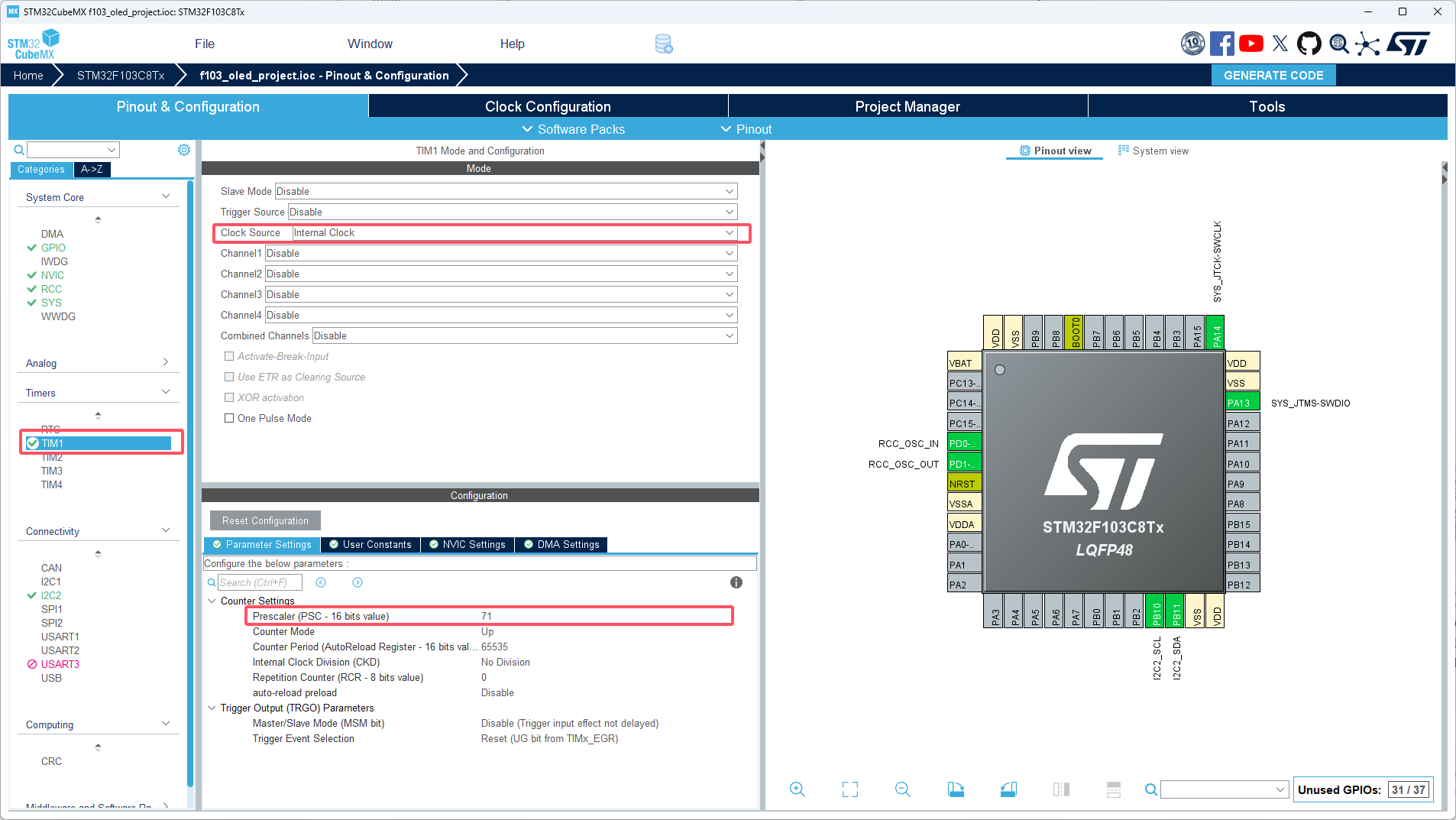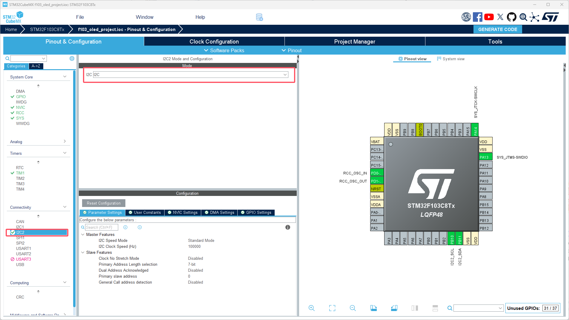 首先我们要使用CubeMX生产一个模板工程,主要配置I2C通讯与定时器(us级延时)