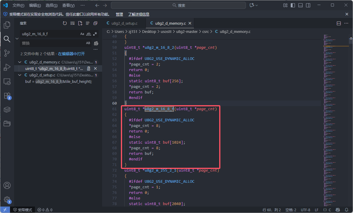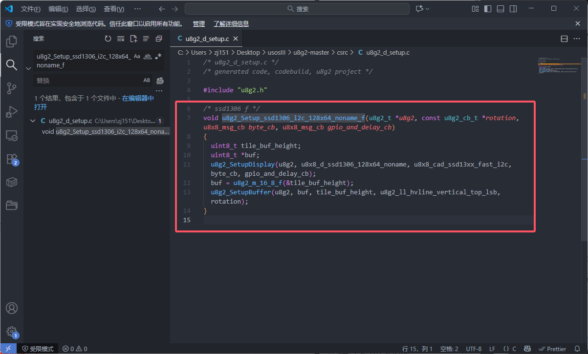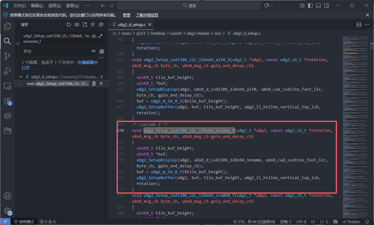 本次使用的OLED是IIC接口,只留本次要用到u8g2_Setup_ssd1306_i2c_128x64_noname_f就好,其它的可以删掉或注释掉。这里建议使用vscode或其他好用的编辑器来搜索到这个函数,将其前后的其他函数删除。