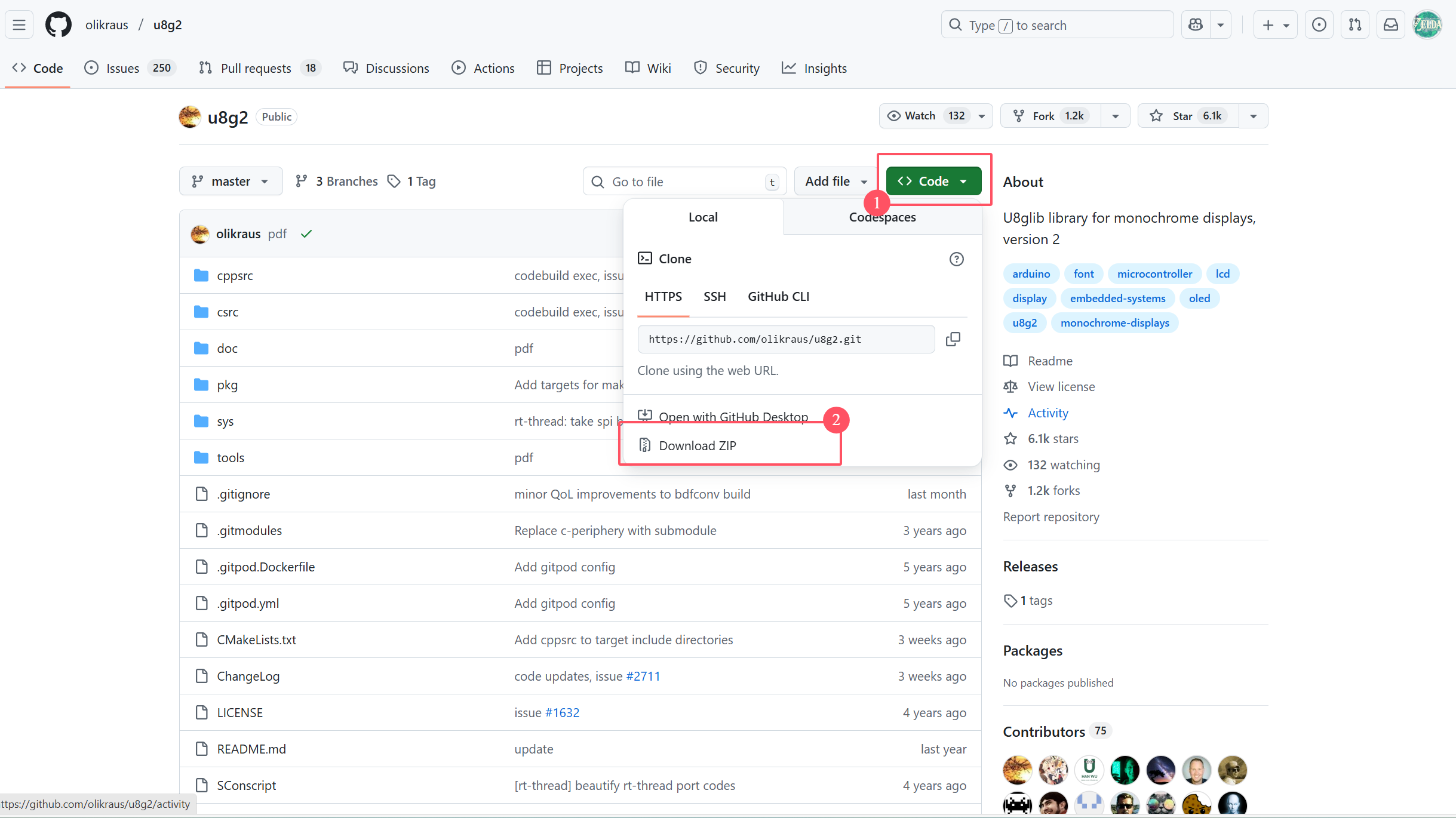 进入源码地址后下载整个U8g2图形库的压缩包。