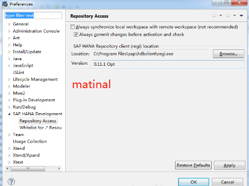1、配置SAP HANA Development→Repository Access,配置过程中发现只安装了HDB_STUDIO_WINDOWS_X86_64,尚未安装HDB_CLIENT_WINDOWS_X86_64,安装CLIENT后,配置如下图所示: