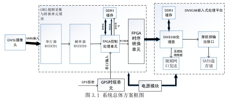 3.1 系统总体方案及工作原理 3.1.1 系统总体方案 基于 GMSL 的车载视频采集与存储系统总体方案框图如下图 3.1 所示,主要由 GMSL 视频采集与转换单元、DM8168 嵌入式数字视频采集单元、GPS 时统单元和电 源模块共四个功能模块构成。 其中,系统核心处理平台采用 FPGA+DM8168 架构,整个硬件系统由 FPGA 处理 器、DM8168 异构多核 SoC 片上系统、外围接口电路和各功能模块电路组成。 图 3.1 系统总体方案框图 各功能模块的主要功能如下: (1)GMSL 视频采集传输链路单元 GMSL 视频采集传输链路单元模块主要包括 GMSL 串行器、GMSL 解串器、FPGA 控制器、DDR3 缓存单元和 FPGA 接口时序转换模块等子模块。其主要功能是将 GMSL 相机采集的视频数据通过 GMSL 链路传输,由 FPGA 对视频数据进行时标叠加,然后 通过FPGA接口时序转换模块完成对视频数据接口转换方便后端处理器对视频信号数 据进行采集处理。 (2)DM8168 嵌入式数字视频采集单元 DM8168 嵌入式数字视频采集单元模块主要包括 DM8168 处理器、SATA 盘存储 模块、网口发送模块和 DDR3 缓存单元。DM8168 处理器负责对 FPGA 输出的数字视 频信号进行采集,然后对视频数据作图像处理。SATA 存储模块负责将原始视频数据 存储到 SATA 电子盘。网口发送模块主要是利用千兆以太网将 DM8168 处理器压缩编码后的视频数据发送到上位机。