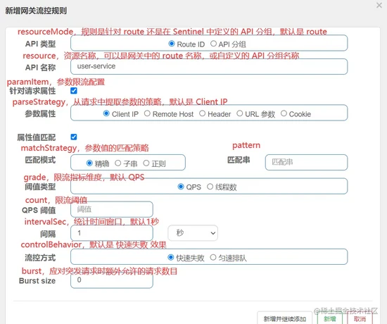 如上图所示,我已经将网关流控规则的字段对应标注上了,详细释义可见 Sentinel 官方文档: