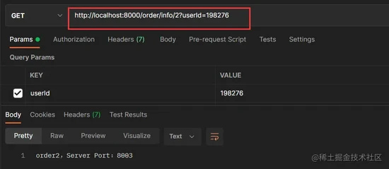 下面开始测试,根据配置的路由,我们通过网关访问 http://localhost:8000/order/info/2 :