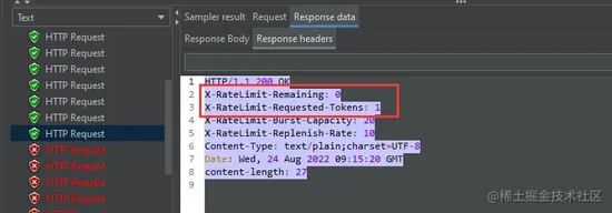 再来通过 JMeter 模拟一下同时有大量请求的情况,当请求数量超过令牌桶的容量的时候,将会限流。
