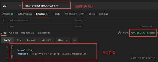 然后通过网关访问 user-service 这个 route,快速刷新,达到1秒内大于1个QPS时,就被限流了: