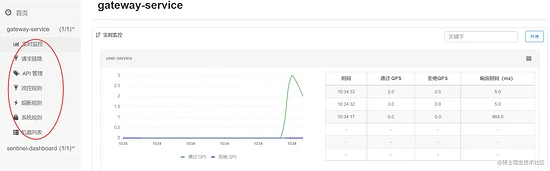 通过网关访问一下 user-service 的 API,然后在 Sentinel Dashboard 上就能看到网管服务了,如下图所示: