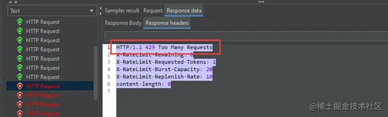 按照前文配置了限流规则后,如果请求满足了限流的规则,那么将返回如下内容: