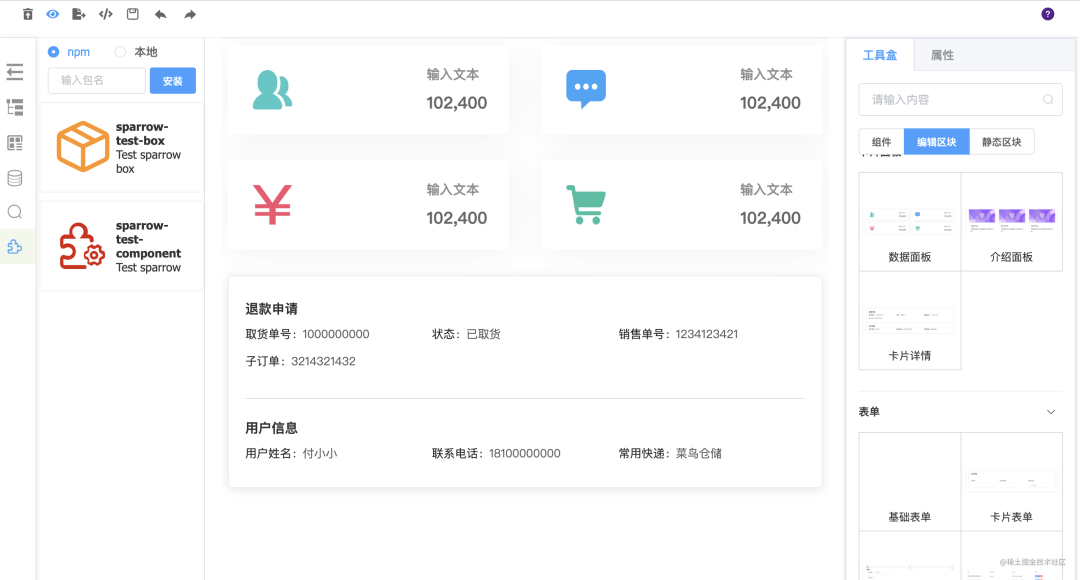 sparrow 是一个场景化低代码(LowCode)搭建工作台,它的核心目标仅有一条“提升研发效率”,目前提供基于Vue、Element-UI 组件库中后台项目的实践,实时输出源代码。