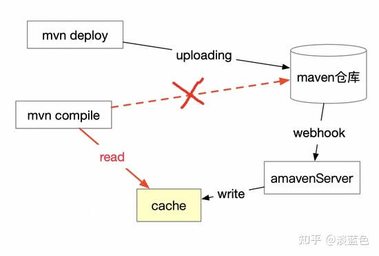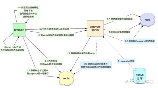 从上图中可以看到amaven-server,它主要负责依赖树缓存的读写性能,保障存储可靠性,及保证缓存的正确性等。