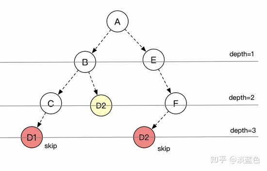 我们来看看maven的仲裁机制,无论是maven2还是maven3,最主要的仲裁原则就是depth。相同ga或相同gav,谁更deeper,谁就skip,当然仲裁的因素还有scope,profile等。结合depth的仲裁机制,按层遍历(BF)会更优,也更好理解。如下图,如按层来遍历,则红色的二个D1,D2就会skip掉,不会重复解析。(注意,实际场景是C的D1还是会被解析,因为它更左)。