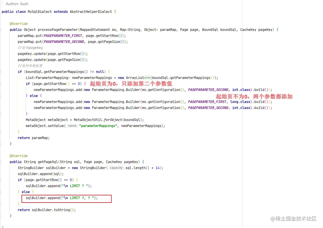 可以看出在MySqlDialect中按照MySQL的语法做了实现,并且起始页不为0时采用的是limit ?,?语法。