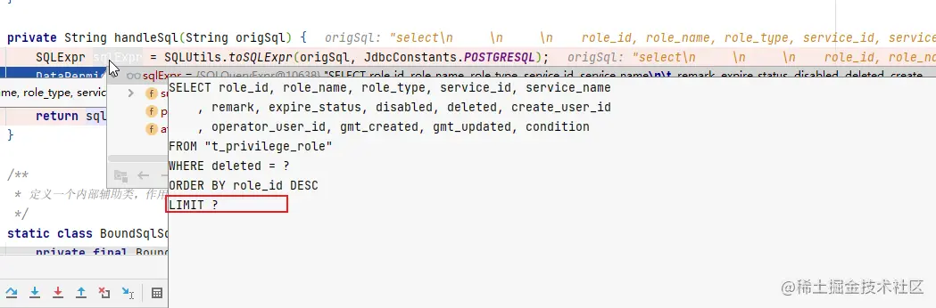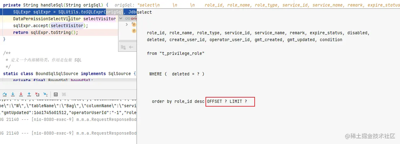 那回到debug中的现象,为什么offset条件没有了呢?是不是在druid的SQLUtils解析SQL的时候出问题了呢?持着怀疑态度我又debug一遍,发现在SQLUtils解析完SQL后,分页条件就已经变了。