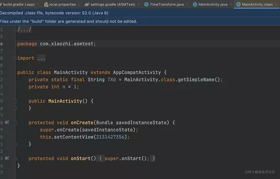// 读取Class文件 String clazzFilePath = "/Users/xiaozhi/AndroidStudioProjects/ASMTest/app/build/intermediates/javac/debug/classes/com/xiaozhi/asmtest/MainActivity.class"; ClassReader classReader = new ClassReader(new FileInputStream(clazzFilePath)); ClassWriter classWriter = new ClassWriter(ClassWriter.COMPUTE_MAXS); MethodTimeConsumeClassVisitor methodTimeConsumeClassVisitor = new MethodTimeConsumeClassVisitor(Opcodes.ASM5, classWriter); classReader.accept(methodTimeConsumeClassVisitor, ClassReader.SKIP_FRAMES); // 写入Class文件 byte[] bytes = classWriter.toByteArray(); FileOutputStream fos = new FileOutputStream(clazzFilePath); fos.write(bytes); fos.flush(); fos.close(); 复制代码