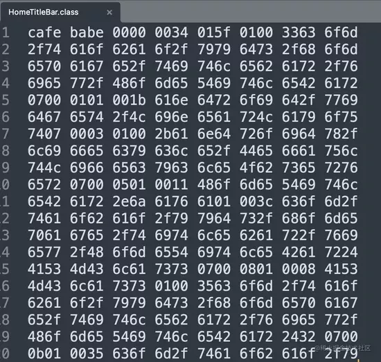 但其实这是IDE为了方便开发者查阅,特意解析渲染了CLASS文件。如果直接拖进编辑器查看这个文件的话,我们可以看到它其实是这样的: