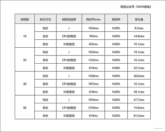 本文第一编写了同步和异步代码,并在代码中输出了耗时日志。第二分析单次执行同步和异步的表现,异步优于同步。第三结合不同线程池配置进行压测,如果线程池选择不合适,异步执行性能不如同步,所以要配置合适线程数。