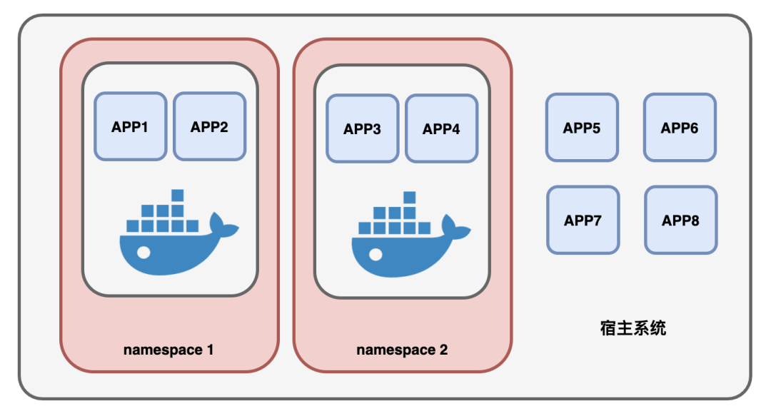 而每个命名空间都是独立存在的,命名空间里面的进程都无法看到空间之外的进程、用户、网络等等信息。